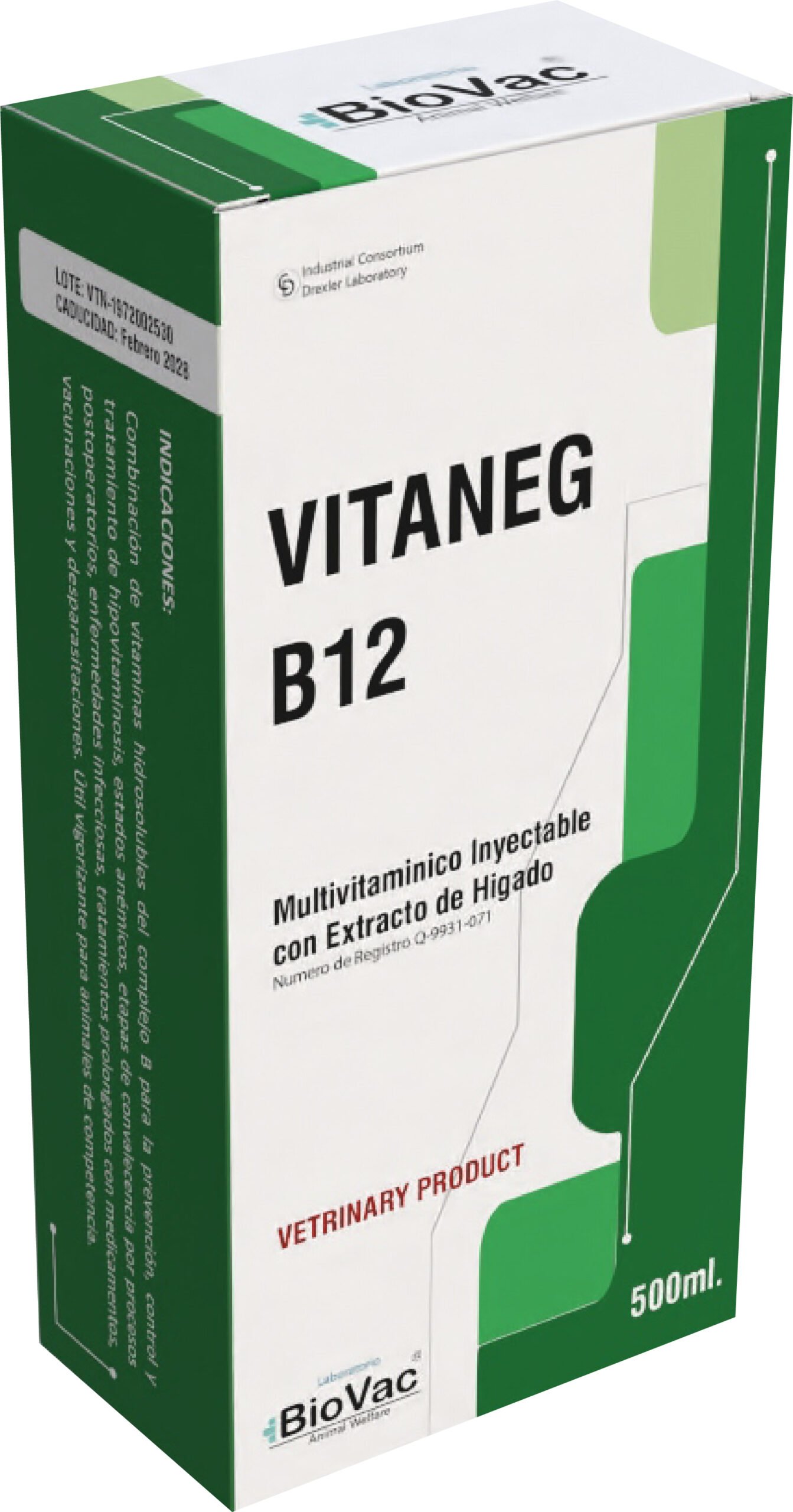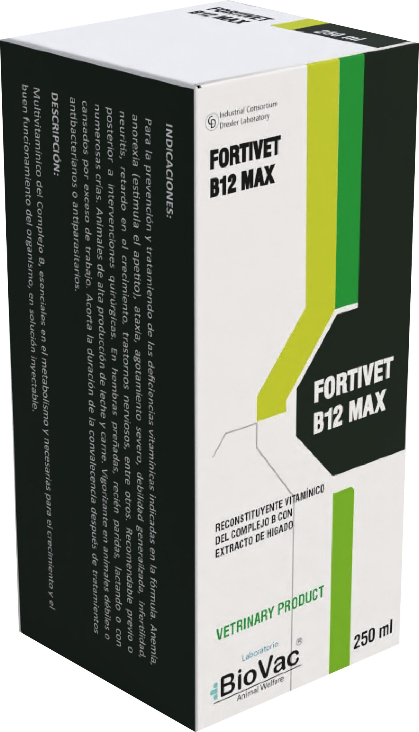 Multivitamínico del Complejo B, esenciales en el metabolismo y necesarias para el crecimiento y el buen funcionamiento del organismo, en solución inyectable. Para la prevención y tratamiento de las deficiencias vitamínicas indicadas en la fórmula. Anemia, anorexia (estimula el apetito), ataxia, agotamiento severo, debilidad generalizada, infertilidad, neuritis, retardo en el crecimiento, trastornos nerviosos, entre otros. Recomendable previo o posterior a intervenciones quirúrgicas. En hembras preñadas, recién paridas, lactando o con numerosas crías. Animales de alta producción de leche y carne. Vigorizante en animales débiles o cansados por exceso de trabajo. Acorta la duración de la convalecencia después de tratamientos antibacterianos o antiparasitarios.